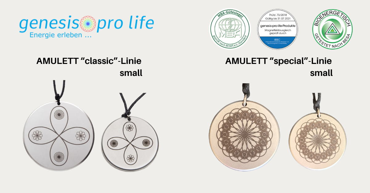 Das Biophotonen AMULETT special small ist die Rundum-Versorgung zur Aufrechterhaltung und Energetisierung Ihres Energiefeldes für Unterwegs. Das AMULETT special small hat auf beiden Seiten die genesis pro life Symbole mit Lasertechnik mehrfach gedreht und übereinander eingraviert. Deshalb ist die Oberfläche etwas rauer und nicht so glatt, wie beim AMULETT classic small.Die neue „special“-Linie hat alle Eigenschaften der "classic"- Linie und ist darüber hinaus noch deutlich leistungsstärker. Die energetische Ladung des Körpers kann wie bei einer Batterie im Laufe des Tages durch viele verschiedene äußere Einflüsse abnehmen. Mit Hilfe der genesis pro life Technologie können sich Ihre Zellen, ähnlich einer Batterie mühelos und sehr schnell wieder aufladen und regenerieren. WLAN, DECT, Mobilfunk, Mikrowellen, magnetische Erd- oder mentale Strahlungsfelder werden schnell und wirksam energetisch aufgewertet und optimiert. Gerade bei Kindern im Alter von 0-12/14 Jahre und natürlich auch Haustieren, kann das AMULETT manchmal zu groß und/oder zu schwer sein. Deshalb wurde das Biophotonen AMULETT special small mit gleicher Wirkweise als Alternative entwickelt. Der Unterschied zwischen dem Biophotonen AMULETT special (Ø 33,33 mm, 24g) und dem Biophotonen AMULETT special small (Ø28 mm, 17 g) sind zum einen Größe und Gewicht, zum anderen Kraft und Intensität. Das AMULETT special small ist kleiner und leichter und hat dementsprechend etwas weniger Kraft und Intensität. Als Faustregel gilt, je größer das Produkt, je kraftvoller und schneller wird der Regenerationsprozess in Gang gesetzt. Sie können natürlich auch das große AMULETT wählen, wenn Ihr Kind schon älter ist und sich damit wohl fühlt. Das AMULETT schimmert silbern und hat auf beiden Seiten die genesis pro life Symbole mit Lasertechnik eingraviert. Es besteht aus hochwertigem chirurgischem Edelstahl und ist dadurch extrem widerstandfähig und hautfreundlich. Das AMULETT ist auch für Allergiker geeignet (gilt auch für Nickelallergien). Wechselwirkungen oder Beeinträchtigungen mit einem Herzschrittmacher können wir ausschließen, da keine elektrischen Impulse gesendet werden. Das runde, filigrane schwarze Trageband mit 80cm Länge besteht aus Baumwolle und bietet hervorragenden Tragekomfort. Ein neues Trageband können Sie jederzeit bei uns im Shop unter folgendem Link erwerben Ersatz-Trageband für Biophotonen AMULETTSie können jedoch auch jede beliebige Kette oder ein anderes Band Ihrer Wahl benutzen, ohne die Wirkung zu beeinträchtigen. UNSER TIPP: Neben dem AMULETT empfehlen wir zusätzlich einen CHIP Handy classic oder einen CHIP Handy special auf dem Handy anzubringen. Weiterführende Informationen zur Wirkweise, sowie Tipps und Erfahrungen zum AMULETT finden Sie hier.Ihre Fragen nimmt unser Support-Team gerne per Mail oder auch telefonisch entgegen. Die Daten und Telefonzeiten finden Sie in der Fußzeile unserer Homepage